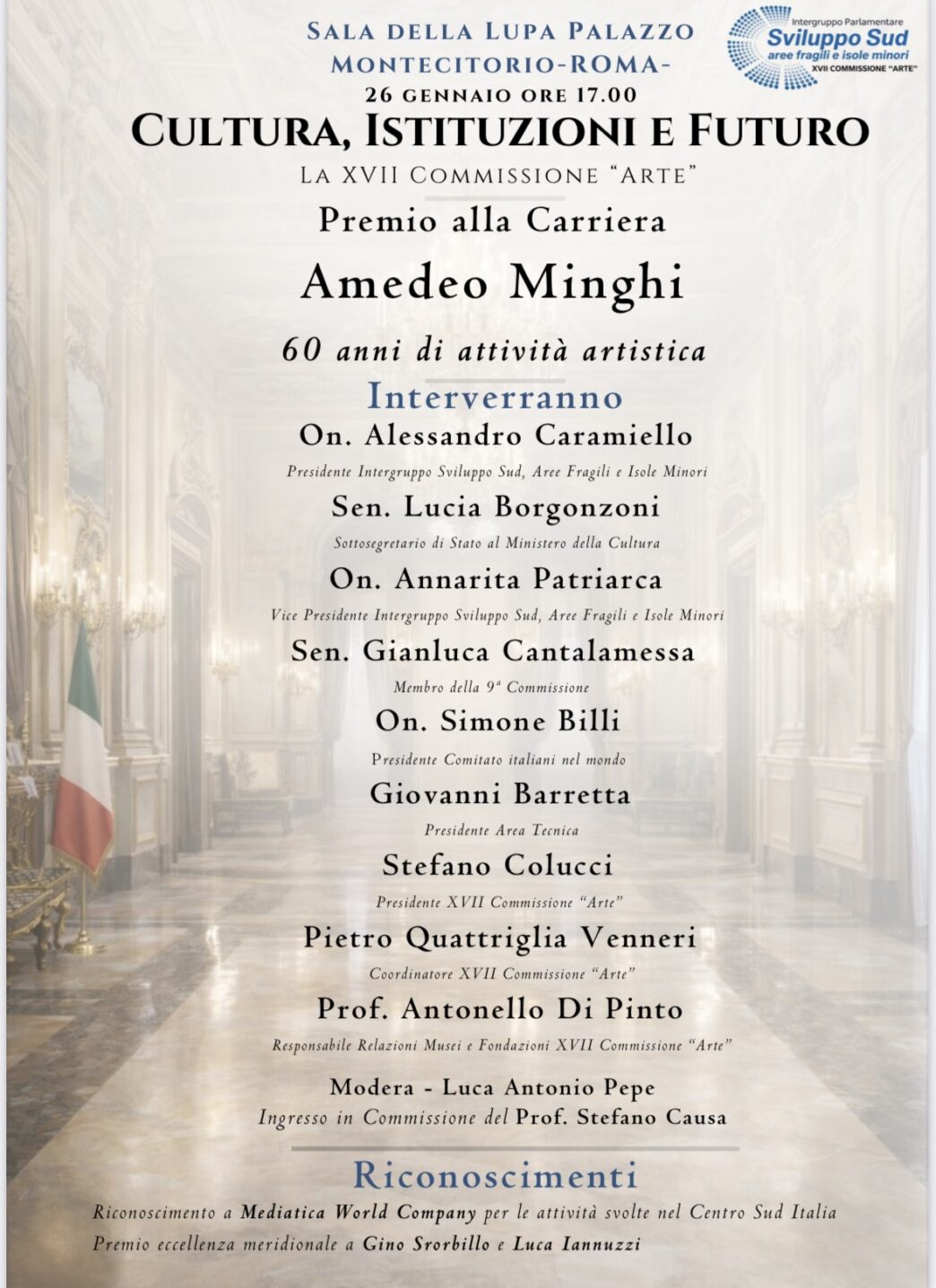 Momento centrale della giornata sarà il conferimento del Premio alla Carriera al Maestro Amedeo Minghi, in occasione dei 60 anni di attività artistica, per intercessione di Antonello Di Pinto , autorevole membro della XVII Comm. “Arte”. Un riconoscimento che celebra un percorso umano e professionale capace di attraversare sei decenni di storia musicale italiana con coerenza, profondità poetica e sensibilità civile, lasciando un segno duraturo nel patrimonio culturale del Paese.