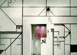 Il busto di Antonio Gramsci nel vano scala e la bandiera della Comune di Parigi all’ingresso contribuiscono alla narrazione ideologica attraverso l’articolazione degli spazi.