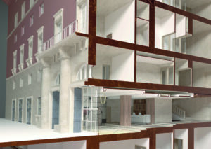 Con la riconversione della sede da ufficio politico a struttura alberghiera, il progetto di recupero affidato allo Studio Costa Progettazioni, su committenza di Botteghe Oscure SRL nell’immobile di proprietà di Finanziaria Tosinvest, ha posto al centro la questione della continuità identitaria come memoria e della compatibilità funzionale come elemento di valorizzazione.