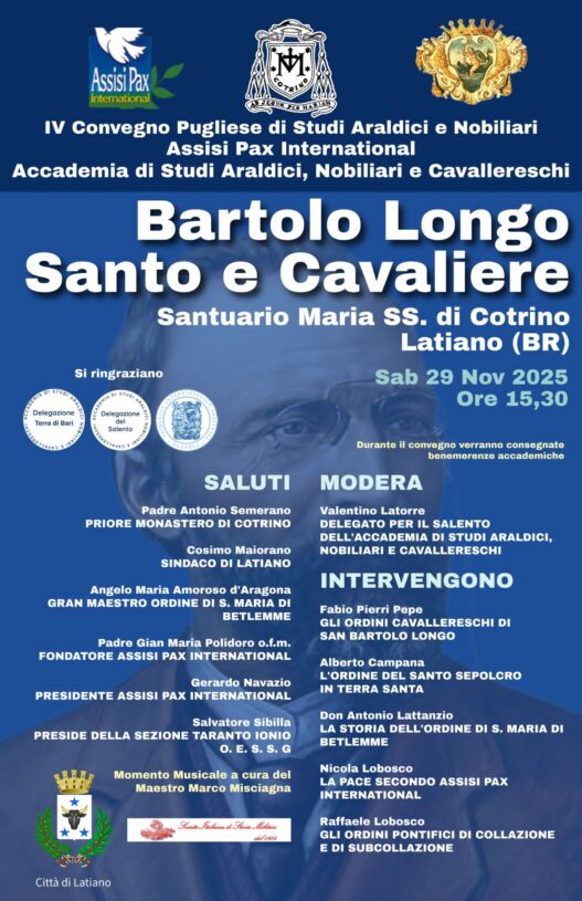 Questa iniziativa assume particolare rilevanza poiché è la prima volta che le onorificenze cavalleresche attribuite a Bartolo Longo vengono analizzate con un approccio storico e araldico, offrendo così una nuova prospettiva sulla figura del beato. L’incontro non si limita a celebrare il fondatore del Santuario di Pompei, ma invita a riscoprirlo come uomo impegnato anche nella costruzione di un ideale cavalleresco fondato sulla carità, sulla giustizia e sulla pace.
