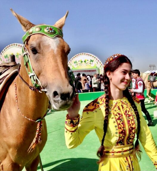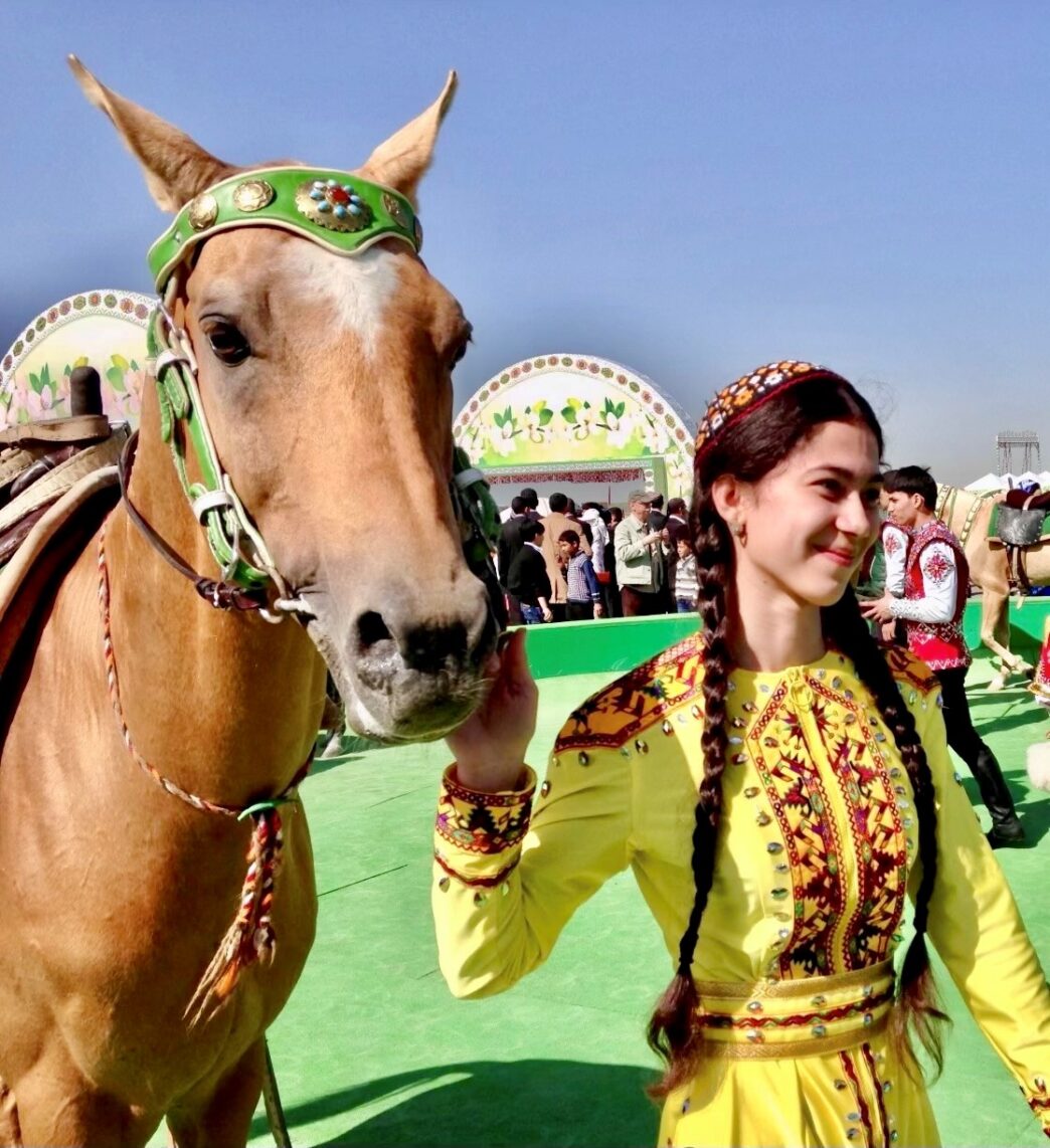 Il Turkmenistan, la cui superficie (NB: 488.000 km2) è compresa tra quella dell’Italia e della Francia, ma la cui popolazione è poco meno di dieci volte inferiore (da 7 a 7,5 milioni) a quella di quest’ultima, è un mondo in gran parte minerale con il deserto del Karakum, noto anche per le sue notevoli riserve di gas (NB: 4° al mondo dopo Russia, Iran e Qatar). La popolazione ha potuto svilupparsi solo nelle zone periferiche del paese, dove è disponibile l’acqua (ad esempio il fiume Amu Darya e le pendici dell’Iran). È soggetta ai potenti vincoli della natura, ma vive anche in armonia con essa, in particolare con le specie animali. Il cavallo Akhal Teke, motivo di orgoglio nazionale, è l’emblema del Paese ed è rigorosamente protetto; anche i cani da pastore Allabai (talvolta chiamati “ammazza-lupi”) sono considerati un tesoro del patrimonio collettivo e sono quindi vietati all’esportazione.