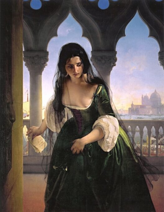 Una bellissima quanto drammatica testimonianza della frustrazione che gettò nell’angoscia molti italiani è illustrata dal dipinto del pittore romantico Francesco Hayez La Meditazione. L’opera rappresenta l’Italia sconfitta, dopo il fallimento dei moti del 1848 e la sconfitta della prima guerra di indipendenza: un periodo che vide la mobilitazione popolare in quelle che passarono alla storia come le Cinque Giornate di Milano. Questa Italia, rappresentata da Hayez, è contrapposta alla Marianna di Delacroix, ed è evidente la citazione, come possiamo osservare nel particolare non insignificante del seno scoperto, anche se la donna rappresentata da Hayez è discinta ma composta. Le differenze sono evidenti: quella di Hayez è un’Italia che non rispetta la retorica dell’iconografia tradizionale, perché meditativa. Tanto la Marianna francese è rappresentata nell’esaltazione dell’azione, quanto l’italiana è raffigurata assorta nella riflessione e con gli occhi nel vuoto. La francese appare come una donna del popolo, l’altra dai tratti aristocratici e affranta: alla testa d’una folla in azione la prima, in assoluta solitudine e immersa nel silenzio la seconda. Con la bandiera al vento la Marianna, con un pesante tomo di storia patria la giovane donna di Hayez, e un crocifisso, simbolo del martirio e della fede.